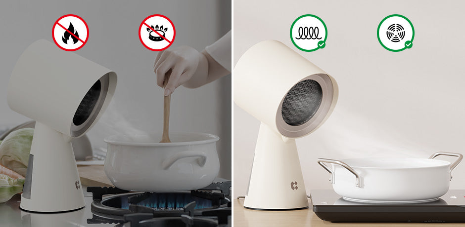 - ⚠️Attention⚠️: HOOD TO GO is recommended for use with cooking appliances (eg. induction cooker, electric grill, electric heating cooker, etc, and can not be used for open flame cooking. The air inlet should be as close as possible to the cooking surface of other appliances (no more than 10cm away) to improve the efficiency of the extraction rate.