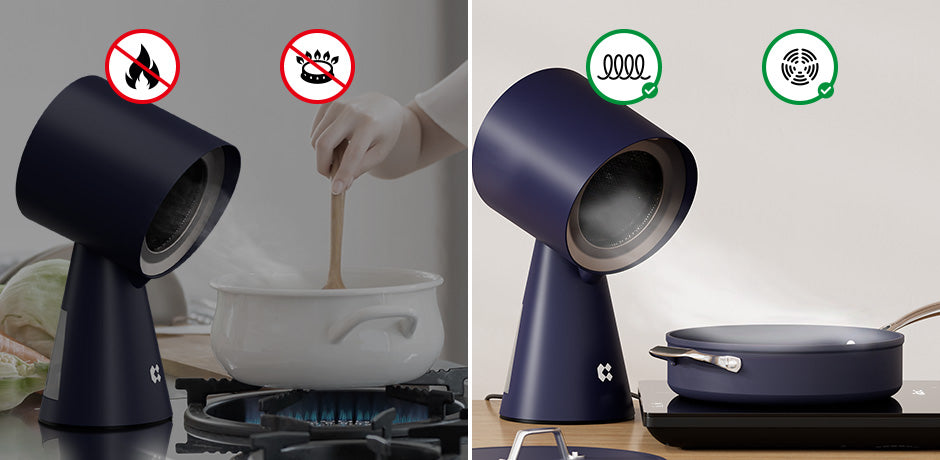 • ⚠️Attention⚠️: HOOD TO GO is recommended for use with cooking appliances (eg. induction cooker, electric grill, electric heating cooker, etc, and can not be used for open flame cooking. The air inlet should be as close as possible to the cooking surface of other appliances (no more than 10cm away) to improve the efficiency of the extraction rate.