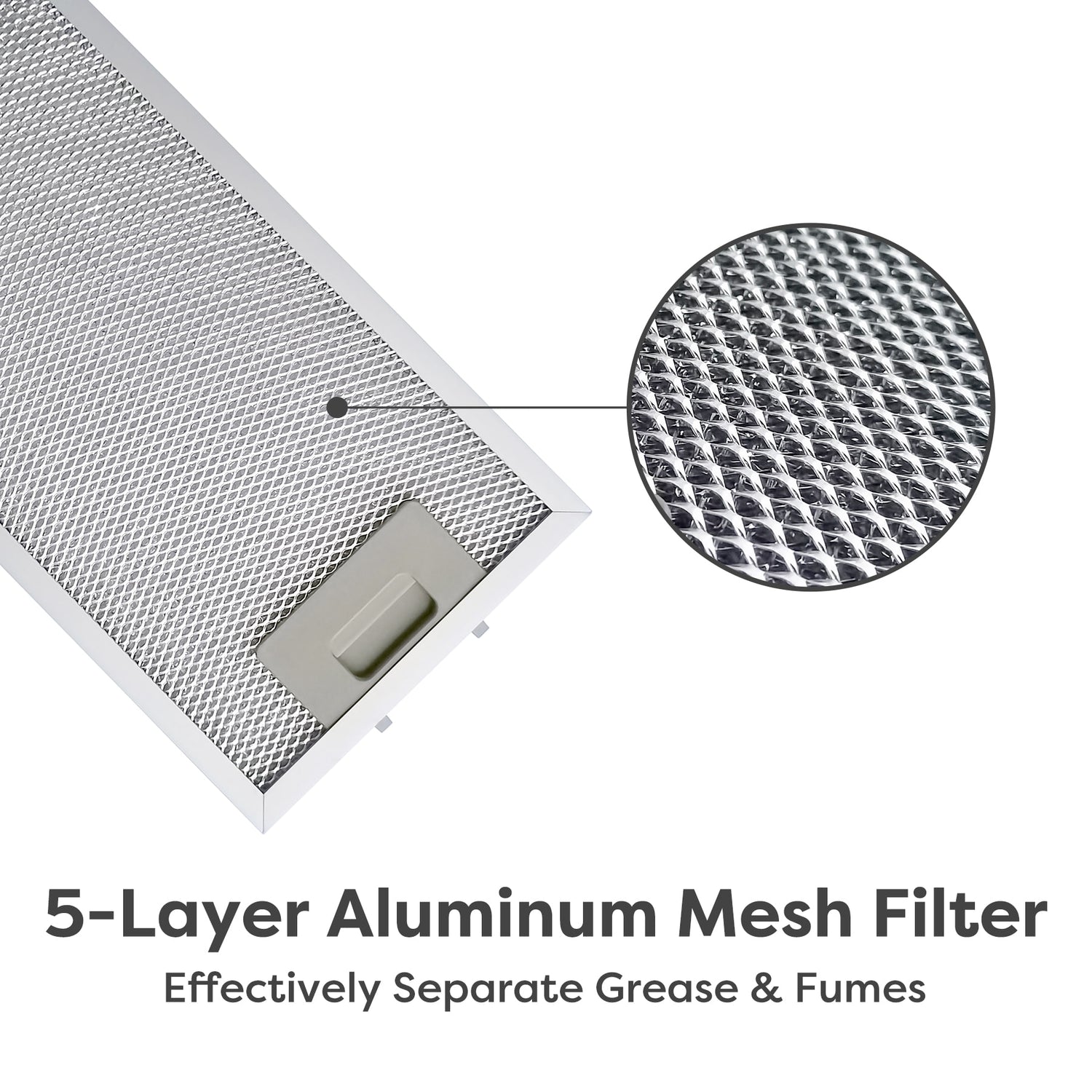 Advanced Filtration: with 5-layer aluminum mesh filters, it can trap cooking grease and oil with ease, preventing smells and odors from spreading in your kitchen. And it can be washed with hot water or the dishwasher but not with corrosive detergent.
