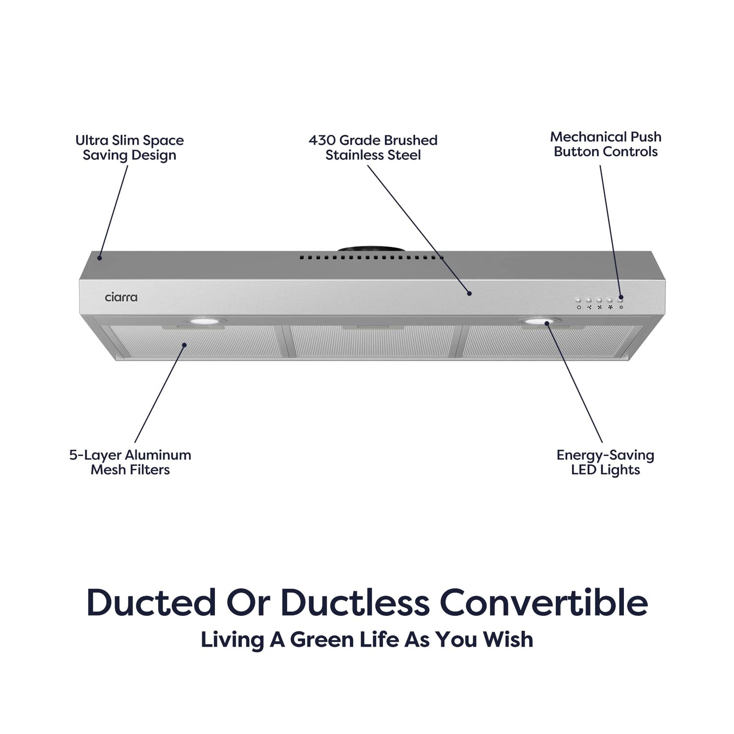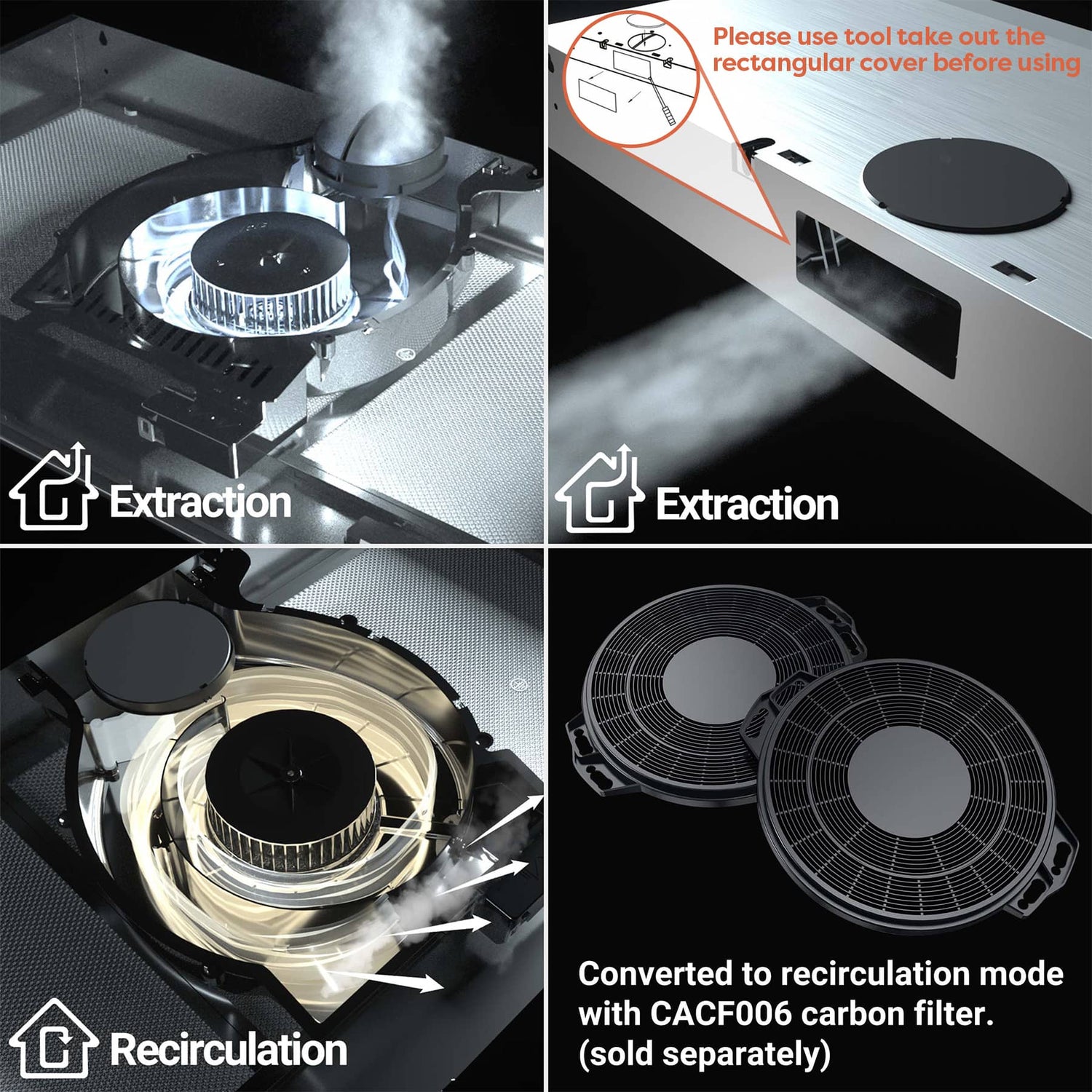 Two Ventilation Modes Optional: Recirculation mode with CACF006-OW carbon filters (not included); installed under your cabinets or cupboards.