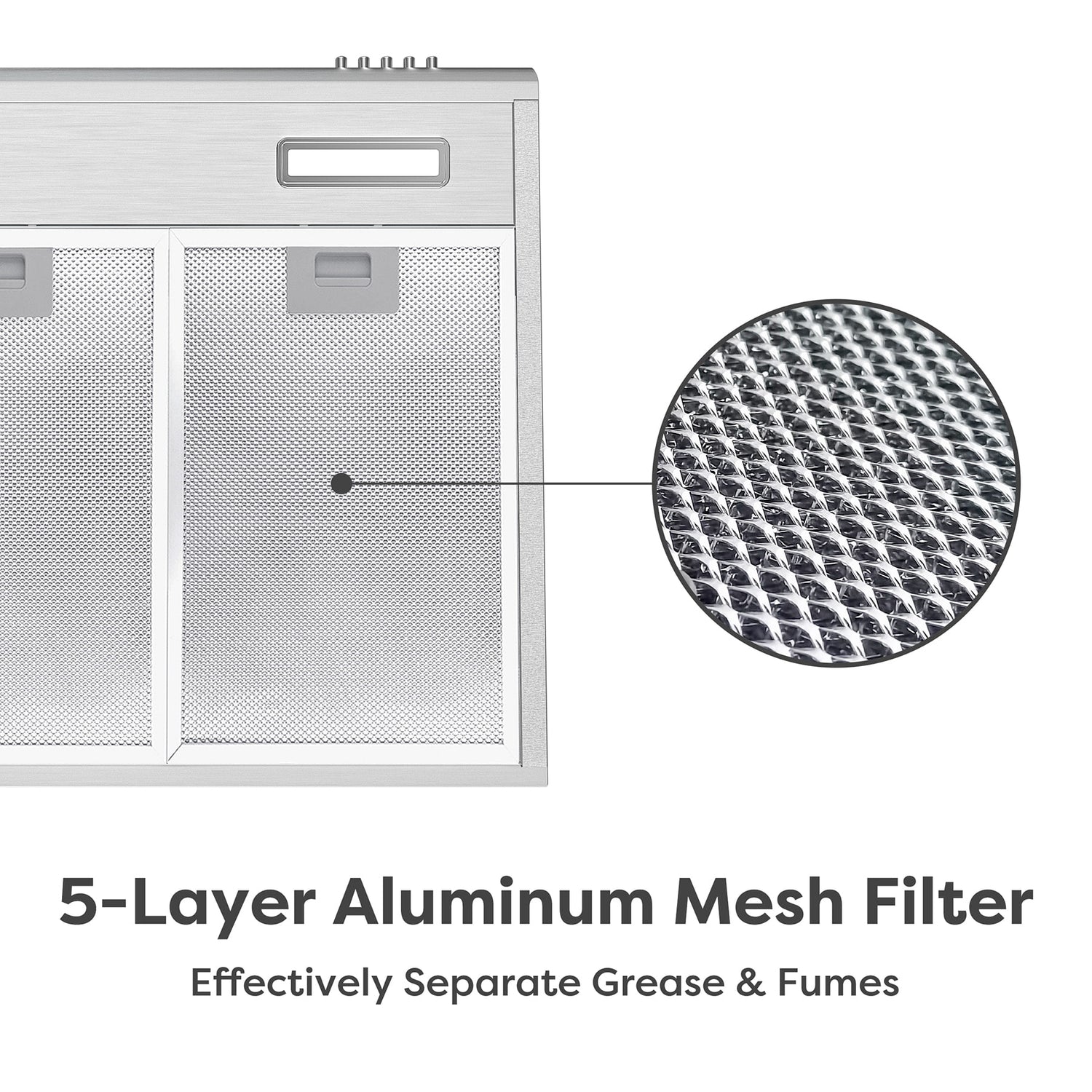 Advanced Filtration: with 5-layer aluminum mesh filters, it can trap cooking grease and oil with ease, preventing smells and odors from spreading in your kitchen. And it can be washed with hot water or the dishwasher but not with corrosive detergent.