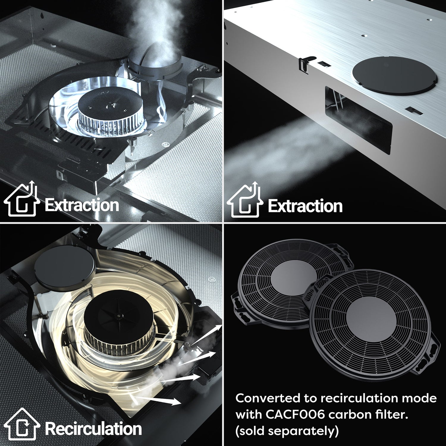 Two Ventilation Mode: the under cabinet range hood can be converted with ducted or ductless. The ductless mode needs to operate with the optional purchase of the CACF006 carbon filter for recirculating.