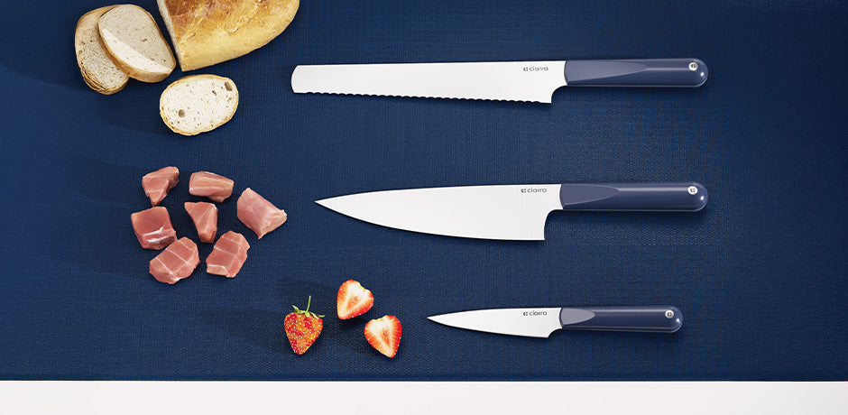 | Blade Length | Chef Knife: 8.3 in. / 210 mm Bread Knife: 9.5 in. / 241 mm Utility Knife: 4.3 in. / 110 mm |
