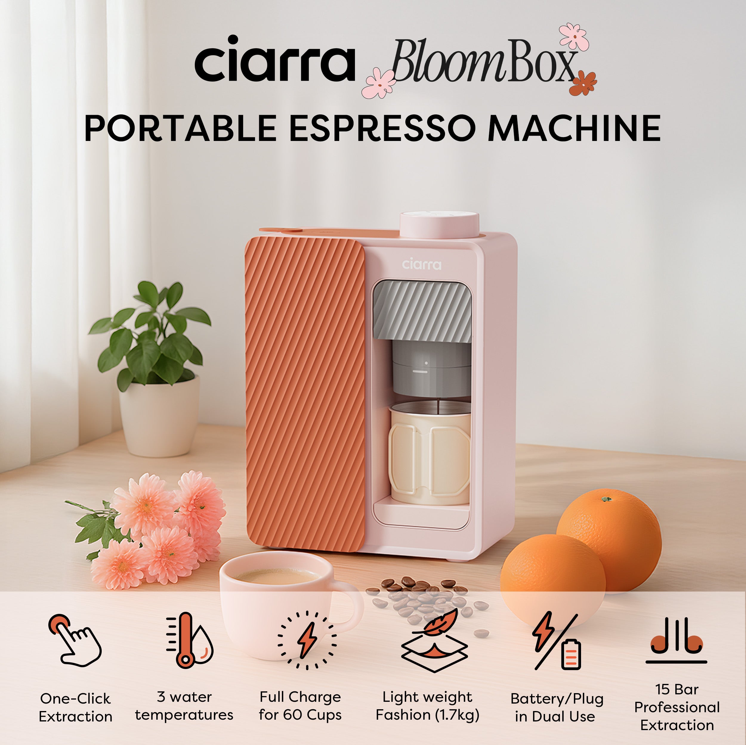 Ciarra BloomBox Portable Espresso Machine 15 Bar Pump, Eco-Friendly Capsule-Free, Home & Outdoor