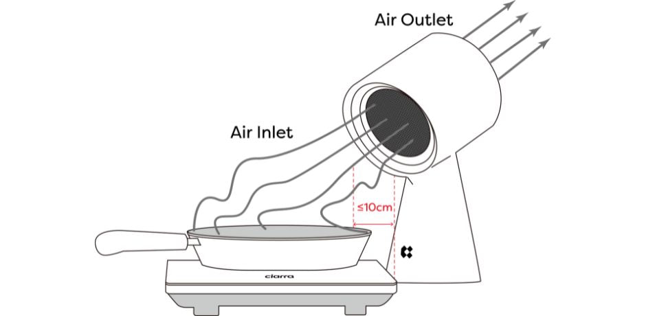 - ⚠️Attention⚠️: HOOD TO GO is recommended for use with cooking appliances (eg. induction cooker, electric grill, electric heating cooker, etc, and can not be used for open flame cooking. The air inlet should be as close as possible to the cooking surface of other appliances (no more than 10cm away) to improve the efficiency of the extraction rate.