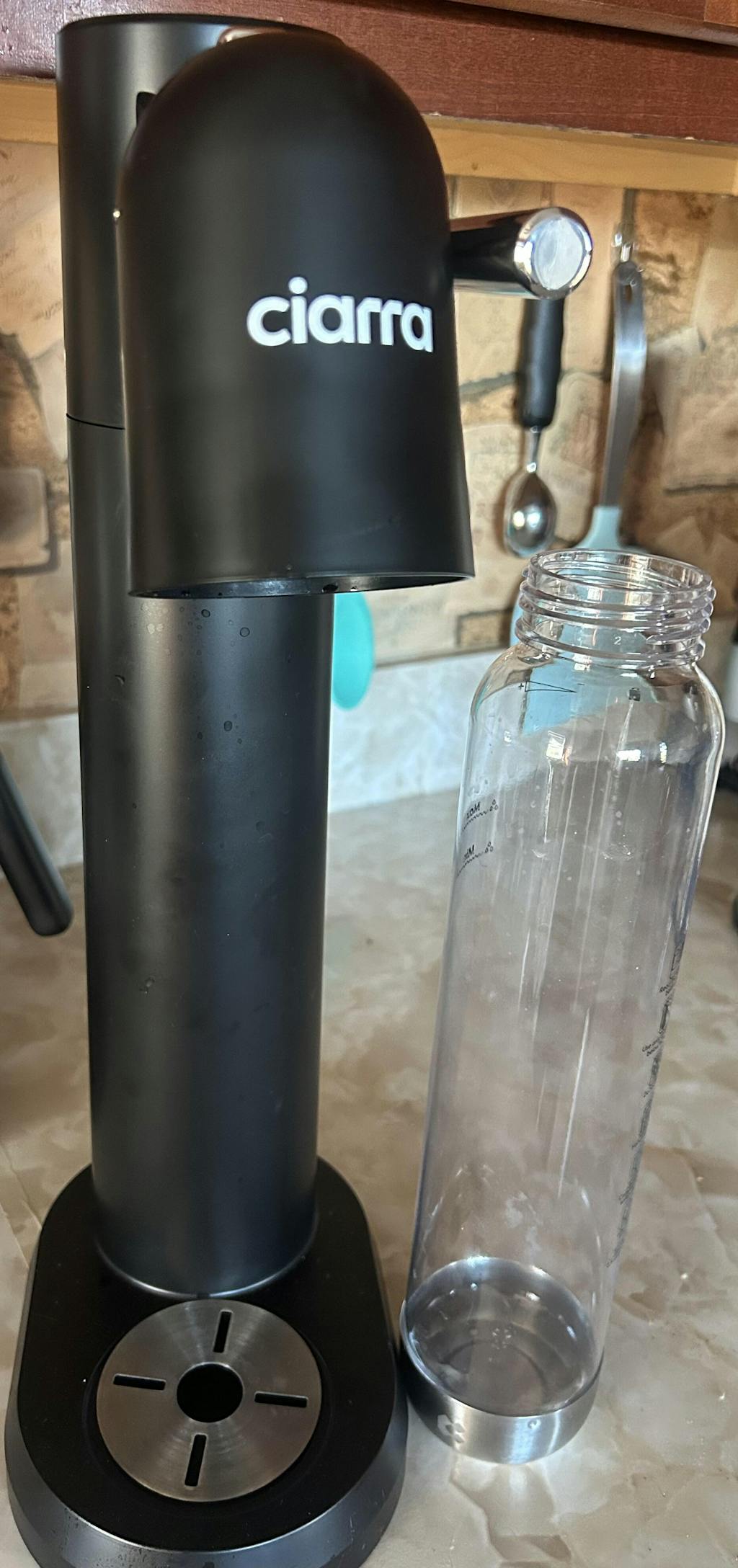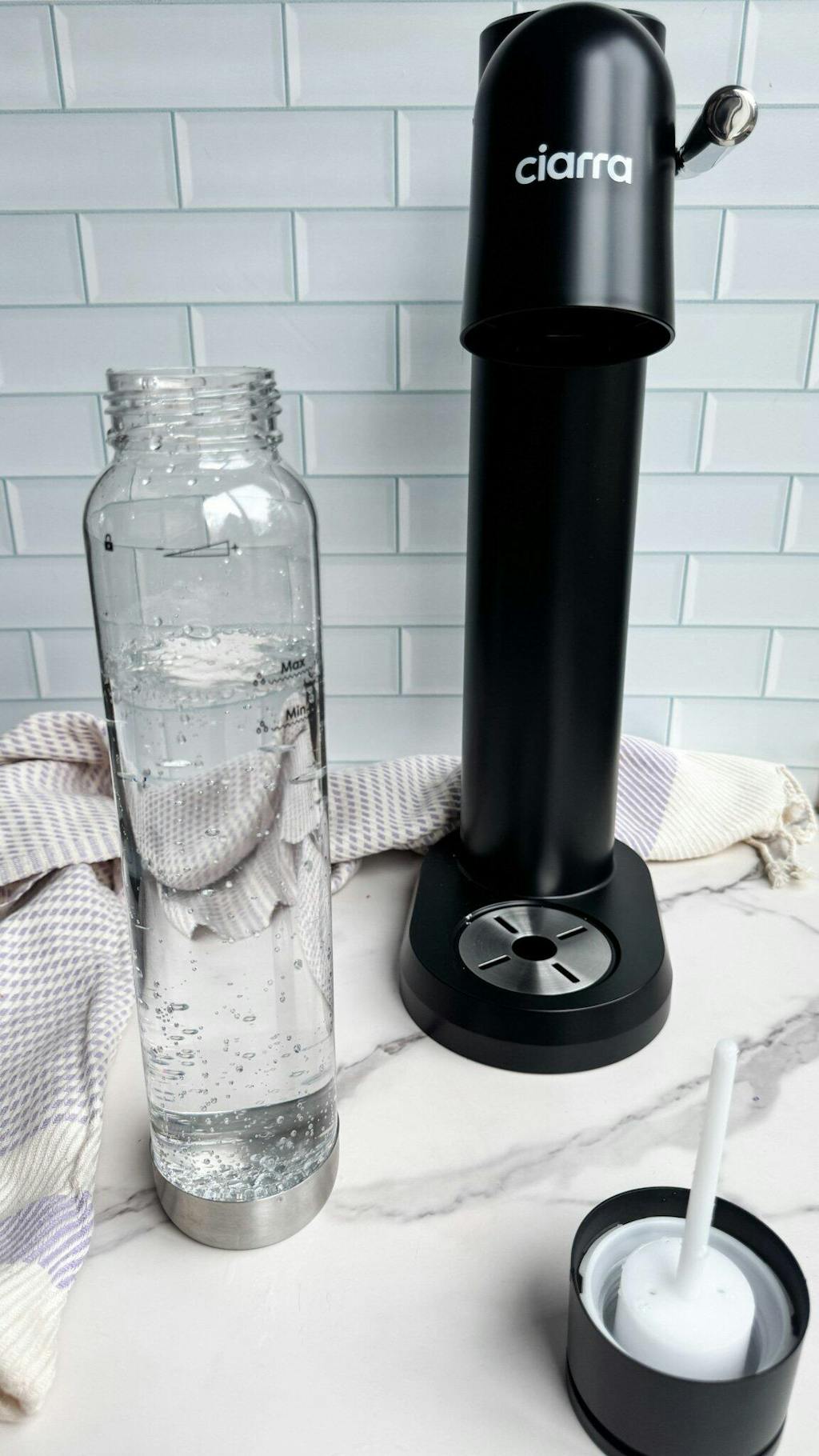 To begin with, I’ll outline the pros of the Ciarra sparkling water maker. The pros include its sleek and attractive design, and the convenient handle that makes sparkling water easy. The main reason I purchased this machine was its ability to frizz anything in it and create ready-made drinks without needing to add ingredients after carbonating the water. I carefully read the instructions in the included booklet and tried to follow them meticulously to avoid any mishaps or leaks.